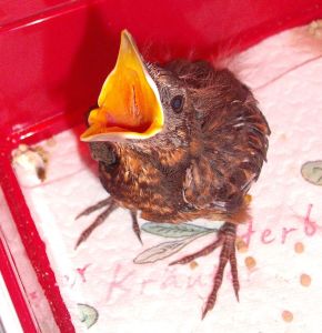 24.05.2011 Heute abend bekamen wir von aufmerksamen Menschen aus unserem Ort eine kleine Amsel gebracht. Unser kleiner Vielfraß dürfte ca.2 Wochen alt sein und frisst uns die Haare vom Kopf. Noch etwa zwei Wochen, in denen das Tier bis auf die nächtliche Ruhezeit stündlich gefüttert