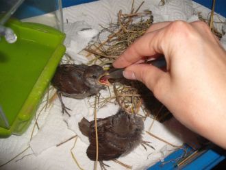Zwei verwaiste Spatzenkinder halten Einzug; die Mutter der beiden brütete in einem Haus unter den Ziegeln, und die beiden sind durch ein Loch in der Dämmung und offenen Paneelen ins Badezimmer gefallen. Bevor die beiden ihre ersten Flugversuche vom Dach aus starten, haben wir die beiden aufgenommen.