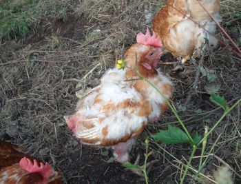Peppi bleibt bei uns und darf in einer kleinen Gruppe von Hühnern in Ruhe und ohne Streß weiterleben.
